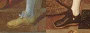Fashionable shoes for men and women were similar, with a flat one-piece sole and rounded toes. Shoes were fastened with ribbons, laces or simply slipped on. Shoes and boots became narrower, followed the contours of the foot, and covered more of the foot, in some cases up to the ankle, than they had previously. As in the first half of the century, shoes were made from soft leather, velvet, or silk. In Spain, Italy, and Germany the slashing of shoes also persisted into the latter half of the century. In France however, slashing slowly went out of fashion and coloring the soles of footwear red began. Aside from slashing, shoes in this period could be adorned with all sorts of cord, quilting, and frills.[46] Thick-soled pattens were worn over delicate indoor shoes to protect them from the muck of the streets. A variant on the patten popular in Venice was the chopine – a platform-soled mule that raised the wearer sometimes as high as two feet off the ground.[47]