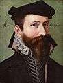 3. Unknown man of 1588 wears a lace or cutwork-edged collar rather than a ruff, with matching sleeve cuffs. He wears a tall grey hat with a feather which is called capotain.