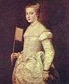 8. Infanta Catalina Micaela wears an entirely black gown with lace collar and cuffs, with white inner sleeves trimmed with gold embroidery or applied braid. Her jewellery includes a double string of pearls, a necklace, worked golden buttons and a belt.