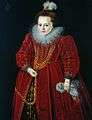 8. Mary Howard, Duchess of Norfolk wears a cloth-of-red velvet gown with "trumpet" sleeves and a gold neckline with a gold embroidered overpartlet, 1557.