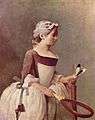 Gradually, trim in the form of applied lace and fabric robings (strips of ruched, gathered or pleated fabric) replaced the plain style. Ribbon bows, lacing, and rosettes became popular, as did boldly patterned fabrics. Silk gowns and stomachers were often intricately embroidered in floral and botanical motifs, demonstrating great attention to detail and care for an accurate portrayal of nature.[4] A mid-century vogue for striped fabrics had the stripes running different directions on the trim and the body of the gown.