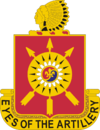The unit's insignia was approved on 10 May 1972.[2] It is a gold coloured metal and enamel device, 1 3/8 inches (3.49 cm) in height. It consists of a coat of arms with a shield, crest and motto. Three arrows symbolize the unit's three assault landings at Sicily, Naples-Foggia and Southern France. The arrows with the buckskin shield also symbolize Oklahoma's Indian heritage, (a depiction of a buckskin shield is found on the state flag of Oklahoma). The sunburst design, a favorite Indian symbol, alludes to the unit's mission to provide general target acquisition, survey and meteorological support to the artillery with a corps. The sixteen stylized rays symbolize the sixteen battle honors of some elements of the organization. The fleur-de-lis represents the unit's service in Europe, World War II. The taeguk alludes to the organization's participation in the Korean War.