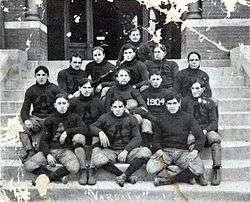 The 1904 football team of the Alabama Polytechnic Institute (now Auburn University). Coach Mike Donahue is in the second row with "1904" on his jersey. | |