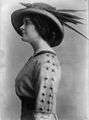 Large hats with wide brims and broad hats with face-shadowing brims were the height of fashion in the early years of the decade, gradually shrinking to smaller hats with flat brims. Bobbed or short hair was introduced to Paris fashion in 1909 and spread to avant-garde circles in England during the war.[6] Dancer, silent film actress and fashion trendsetter Irene Castle helped spread the fashion for short hairstyles in America.[7] Hair, even short hair, was frequently supplemented with postiches, small individual wigs, curls, or false buns which were incorporated into the hairstyle.[8]