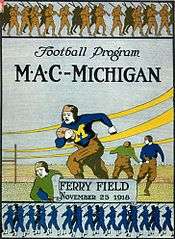 On November 23, 1918, Michigan played its fourth game against Michigan Agricultural College (now known as Michigan State University). The game was played at Ferry Field in front of the largest crowd of the season estimated at between 10,000 and 20,000. Followers of both schools attended in large numbers, "the maize and blue of Michigan and the green and white of M.A.C. decorating the stands the length and breadth of them."[21] The Aggies in 1918 had a new head coach, George Gauthier, and a highly touted African-American running back, Harry Graves. The Aggies had defeated Knute Rockne's Notre Dame the previous week in East Lansing.[21]