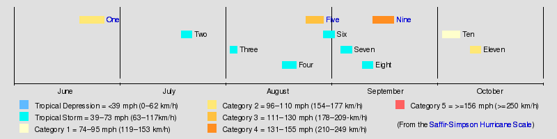 A short-lived tropical storm formed east-northeast of the Leeward Islands on August 17. Moving west-northwest, the system peaked at 70 mph before weakening on August 19. It weakened to a depression on August 21 and dissipated in the Bahamas.