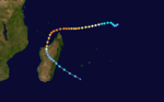 Cyclone Andry reached peak winds of December 9, when MFR estimated winds of 170 km/h (105 mph). The next day, JTWC estimated 1 minute winds of 240 km/h (150 mph).[13] Around that time, Andry was passing just north of the northernmost tip of Madagascar at Diego-Suarez, where the storm produced wind gusts of 250 km/h (160 mph).[1] The cyclone weakened while curving to the southwest and later to the south,[13] making landfall on western Madagascar near Majunga with wind gusts of 198 km/h (123 mph). While over land and turning to the southeast, Andry rapidly weakened into a tropical depression, which later passed near the capital Antananarivo. The storm emerged back into the Indian Ocean on December 14, by which time the system was disorganized.[1] That day, MFR estimated that Andry dissipated, although the JTWC assessed that the system re-intensified slightly and turned sharply southwestward before dissipating over Madagascar on December 16.[13]