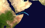 On May 23 a tropical depression developed in the northwest Arabian Sea. It drifted west-northwestward, slowly organizing into a tropical storm on the 26th. It tracked westward through the Gulf of Aden, reaching a peak of 50 mph winds before hitting northern Somalia on the 28th. It quickly dissipated, after becoming the only North Indian tropical cyclone in recorded history to transit the Gulf of Aden.