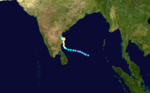 Tropical Depression Three formed in the south-central Bay of Bengal. It tracked west-northwestward, becoming a tropical storm on November 10 and a cyclone on the 11th. A break in the ridge brought it northward, where steering currents collapsed on the 13th. After reaching a peak of 95 mph winds the cyclone looped slowly to the west and hit India on the 14th and dissipating on the 15th. Due to the stalling just offshore, the cyclone brought torrential flooding, resulting in at least 430 fatalities and moderate damage.