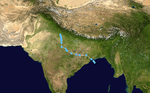 During July 27, a depression developed over the northern Bay of Bengal to the east of the Indian state of Odisha.[2][6] Over the next day the system moved westwards and developed into a Deep Depression, as it made landfall near Badudebpur in Odisha with estimated winds of 55 km/h (35 mph).[6] The system dissipated over East Rajasthan during July 31, as it enhanced monsoon activities over northern and eastern India.[6]