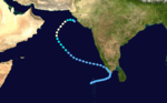 On November 5, an area of convection organized into a tropical depression southwest of the southern tip of India. After moving towards the coast, it turned to the west, finally becoming a tropical storm on the 12th when it reached a favorable environment. After attaining cyclone strength on the 13th, it reached a peak of 90 mph winds. High vertical shear caused it to dissipate on the 16th over open waters.