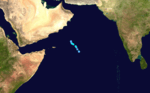 On December 7, a broad area of low pressure developed near southern India within an area of moderate wind shear.[54] On December 11, the JTWC issued a TCFA for the system as it drifted towards the northwest over the Arabian Sea. Two days later, the first advisory on Tropical Cyclone 08A was issued.[13] The large cyclone slowly organized and intensified as it turned towards the north.[54] By December 15, the storm reached its peak intensity with winds of 120 km/h (75 mph).[13] Then, it turned towards the west into an area of higher wind shear.[54] The cyclone gradually weakened as it traveled towards Oman. It made landfall in the country on December 17 with winds of 65 km/h (40 mph) and dissipated later that day.[13] Although it made landfall as a tropical storm, no known damage was reported.[54] The remnants of the storm sank a ship, killing 18 fishermen.[55]