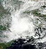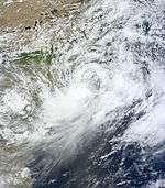 Late on September 20, an area of low pressure developed approximately 200 nautical miles (370 km; 230 mi) south of Chittagong, Bangladesh.[22] Under the influence of strong vertical wind shear and monsoonal activity in the Bay of Bengal, the system was unable to strengthen and the JTWC later reported that the system had dissipated.[23] However, on September 22, the IMD started monitoring the system as a Depression and initiated bulletins on the system, designating it BOB 03.[24] Late on that day, BOB 03 drifted northwest and made landfall over north Orissa close to Balasore.[25] After moving further northwestwards, the depression remained practically stationary over Jharkhand. By the evening of September 23, IMD reported that the depression had weakened into a well-marked low pressure area in their final bulletin for the system, as the storm dissipated to a remnant low.[26]