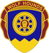 On the coat of arms, there is a crest above the shield. The crest consists of a golden and blue wreath on which stands a gold griffin. Atop the distinctive unit insignia is a brick red scroll inscribed "Wolf Hounds" in gold.