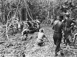 In early 1942, the 2/1st returned to Australia as part of the general transfer of Australian ground troops from the Middle East to the Pacific, following Japan's entry into the war. The battalion returned aboard the USS Westpoint,[9] and subsequently established itself around Ipswich, in Queensland, before being deployed to New Guinea in August aboard the transport Taroona,[10] at the height of the fighting against the Japanese during the Kokoda Track campaign. Initially, the pioneers undertook defensive tasks, with three companies being deployed forward to Owers Corner before moving to Uberi and then on to Imita Ridge, where the Australians sort to make a final stand against the advancing Japanese. There, the battalion occupied the extreme left hand position of a makeshift line alongside the 2/31st, 2/25th, 3rd and 2/33rd Battalions.[11] Later, as the tide of the campaign turned in favour of the Australians, the battalion conducted patrols and portage work along the track from September to November, before being reassigned to carry out mining and labouring work around 9-Mile Quarry, where three companies were deployed. A fourth company was also detached at this time to the Milne Bay area to improve the base's facilities; it remained in New Guinea until October 1943 before returning to Australia for rest and reorganisation aboard the USS Etolin.[12][3]