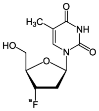 18F-3'-Fluoro-3'-deoxythymidine or 18F-FLT is a tumor-specific PET tracer (radiopharmaceutical) . FLT is suitable for monitoring how tumor responds on cytostatic therapy. It accumulates in proliferating cells - it indicates the activity of ensyme thymidine kinase which characterise the activity of cell division. FLT is phosphorylated as thymidine before incorporating into DNA. Thymidine is essential for DNA replication. Considering missing 3-hydroxy group, polymerisation of DNA is stopped by incorporating of FLT. FLT indicates change of tumor cells proliferation by tracking the restoration of nucleosides from degenerated DNA.[1]