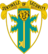 - Description: A gold color metal and enamel device 1 5/32 inches (2.94 cm) in height overall, consisting of a shield blazoned as follows: Argent, on a pale emitting in saltire four lightning flashes Azure (Teal Blue) a key bit to dexter in base, the bow a bear’s head, Or. Attached above the shield is a Gold triparted scroll inscribed “Sentinels of Security” in black letters.