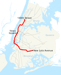 The 3 Seventh Avenue Express/Eastern Parkway Local is a rapid transit service in the A Division of the New York City Subway. Its route emblem, or "bullet", is colored tomato red since it uses the IRT Broadway–Seventh Avenue Line through most of Manhattan.[1] The 3 operates between 148th Street in Harlem, Manhattan and New Lots Avenue in East New York, Brooklyn, making express stops in Manhattan and all stops in Brooklyn, except nights when it short turns at Times Square–42nd Street in Midtown Manhattan.
