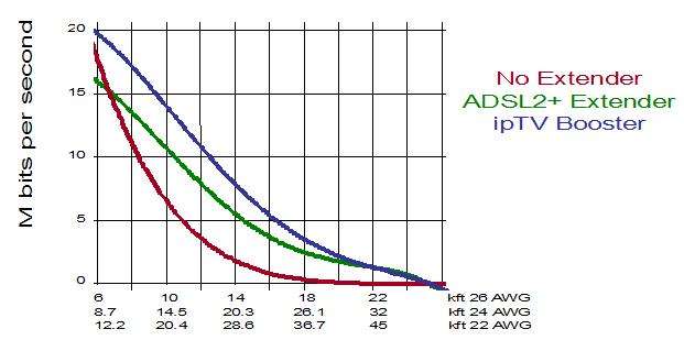 A DSL loop extender or DSL repeater is a device that a telephone company can place between subscriber premises equipment and central office interfaces to extend the distance and increase the channel capacity of digital subscriber line (DSL) connections. ADSL repeaters are deployed by rural telephone companies trying to provide rural Internet service to farms and small towns where it is impractical to place the DSLAM closer to the subscriber. Typical distance improvements with a loop extender are shown in the diagram below, with rate in megabits per second and distance in thousands of feet.[1]