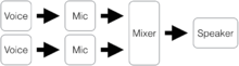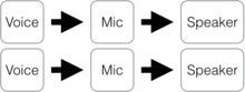 An A/B Sound System is a type of Sound reinforcement system or Public address system. Unlike a more typical sound reinforcement system, an A/B Sound System provides two electrically isolated signal paths from microphone to speaker, resulting in a system where signals from two microphones only interact acoustically and never interact electronically. This is accomplished by placing two separate loudspeakers at each speaker position and feeding the two speakers separate signals from separate microphones.[1] The purported benefit of such a system is a reduction in phase cancellation and intermodulation distortion, and an improvement in speech intelligibility when two microphones are used simultaneously. A/B Sound Systems are unusual because they require double the speakers and therefore have double the cost.[2]