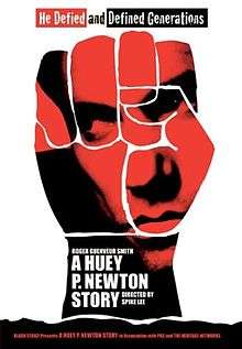 A Huey P. Newton Story (2001) is an American film adaptation directed by Spike Lee. The movie was created, written and performed, as a solo performance, by Roger Guenveur Smith at The Joseph Papp Public Theater. In this performance, Smith creates a representation of the activist Huey P. Newton’s life and time as a person, a citizen and an activist. During the performance, images are shown up-stage from activist movement era. The simple arrangement of Smith sitting in a chair stage-center makes the audience focus on the dialogue of the performer. Smith captures the attention of the audience throughout the film by putting into play his solo performance skills.[1] Smith's idea for the performance originated in 1989 and took root as a stage play in 1996. Smith's performance attempt to show a shy individual that Huey P. Newton believed himself to be. He did not consider himself a charismatic person, although he had made many contributions to his community. Smith shows Newton as a conservative individual who is disgusted by having microphones and cameras close to him.[2]