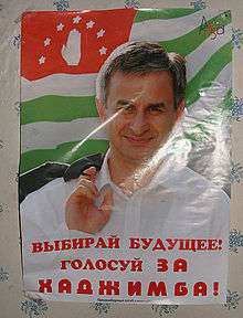 Outgoing president Vladislav Ardzinba was by law prohibited from running for a third term, and his health would not have allowed him to either. Instead, the government's candidate for the presidential election was outgoing Prime Minister Khajimba. On 18 August, Ardzinba said in an interview with Respublika Abkhazia that Khajimba was the person most qualified to succeed him, and he appealed to all voters to vote for him.[18] Khajimba also received the support of the Russian authorities. Russian President Vladimir Putin had worked for the KGB like Khajimba, and posters of the two together were hanging everywhere in Sukhumi.[19] Deputies of Russia's parliament and Russian singers, led by Joseph Kobzon, both a deputy and a popular songster, came to Abkhazia campaigning for Khajimba.