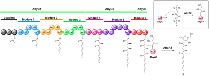 The biosynthesis of atrop-abyssomicin C begins with the synthesis of a linear polyketide chain in a PKS I system that consist of one loading and six extension modules. The polyketide chain is made from five acetates, two propionates, and the glycolytic pathway metabolite. D-1,3-bisphosphoglycerate, the glycolytic metabolite, is transferred to AbyA3 (an acyl-carrier protein) by AbyA2 to generate the glyceryl-ACP. AbyA1 facilitates the attachment of the glyceryl-ACP to the polyketide chain and the detachment of the polyketide from the polyketide synthase to form intermediate 2.[7][8][9]
