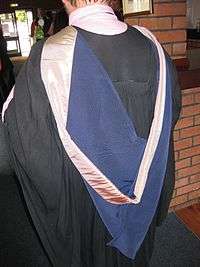 Holders of foundation degrees and certain diplomas wear a black hood bound with a twisted cord of blue, crimson and gold