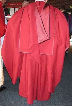 Doctors wear a hood of crimson (in the case of the PhD, EngD, DNursSc, DClinPsy, DEdPsy and DMin) or scarlet (in the case of the higher doctorates DD, LLD, MD, DMus, DLitt, DSc, DScEcon and DChD) cloth, lined and bound in the relevant faculty colour silk.