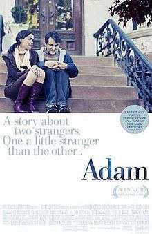 Adam had its world premiere at the 2009 Sundance Film Festival on January 20, 2009 where it won the Alfred P. Sloan Prize for "an outstanding feature film focusing on science or technology as a theme, or depicting a scientist, engineer or mathematician as a major character."[6] Although producer Leslie Urdang was initially doubtful of the film's chances of finding a distributor at Sundance,[7] Fox Searchlight Pictures bought the distribution rights.[8] In March 2009, Adam was screened at the Method Fest Independent Film Festival, winning the Jury Award for Best Picture.[9] It was shown at the Seattle International Film Festival,[10] Edinburgh Film Festival,[11] CineVegas Film Festival[12] and San Francisco Jewish Film Festival[13] before it had a U.S. theatrical release on July 29, 2009. It was released on DVD January 5, 2010.[14]