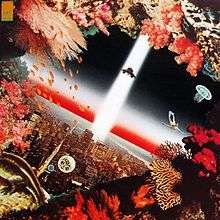 The front cover depicted an advanced civilization with a vast landscape of skyscrapers and red, sunburst-like flames rising out of the cityscape as representations of Agharta's power.[65] Yokoo used a combination of collage, airbrushing, and painting techniques as he had with his previous work, along with postcards collected from his trips to Tahiti and New York City; the cityscape on the front cover was taken from one of his postcards.[61] The back cover showed the city submerged in water, embedded in coral reefs, and hovered over by a diver, fish, and a squid ascending from the city.[63] According to graphic designers Storm Thorgerson and Aubrey Powell, Yokoo depicted groups of jellyfish, coral reefs, and brightly colored fish to suggest an association between Agharta and Atlantis.[62] The foreground of the back cover's illustration featured a reptilian creature. Cultural studies researcher Dagmar Buchwald interpreted this image as an allusion to similar ideas about Lemuria, a mythological continent during Earth's prehistory that was inhabited by an advanced civilization later forced under the Earth's surface after its homeland was destroyed by a great flood.[63]