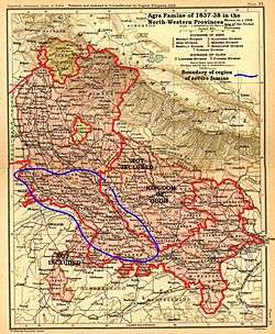 The Agra famine of 1837–1838[2] was a famine in the newly established North-Western Provinces (formerly Ceded and Conquered Provinces) of Company-ruled India that affected an area of 25,000 square miles (65,000 km2) and a population of 8 million people.[3] The central Doab in present-day Uttar Pradesh—the region of the districts of Kanpur, Etawah, Mainpuri, Agra and Kalpi—was the hardest hit; the trans-Jumna districts of Jalaun, Hamirpur, and Banda also suffered extreme distress.[3]