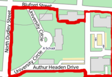 The irregularly shaped historic District is bounded by the eastern side of Dudley Street as its western boundary, stretching eastward between Bluford Street and Authur Headen Drive; and Nocho street as its eastern boundary.[8] The district also includes an elliptical paved driveway, which served as the traditional main entrance to the university, and a 1.5 acres (6,100 m2) grassy lawn which provides a 300 yards (270 m) deep buffer and setback from the Dudley Street to the district's buildings. The five contributing buildings of the district are composed of the university's oldest surviving and virtually unaltered buildings and form the historic core of the Greensboro campus.[8] Built between 1922 and 1939, the buildings are a mixture of Colonial Revival and Classical Revival architecture. Significant buildings within the district include Noble, Morrison, and Murphy Halls; Richard B. Harrison Auditorium; and the James B. Dudley Memorial Building.