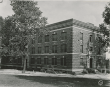 Built in 1939, and named for renowned actor Richard B. Harrison, who taught Drama and directed productions at the college; Harrison Auditorium was designed by architect Leon McMinn.[17] The auditorium was constructed by the Public Works Administration for usage as the college's main auditorium. The flat-roofed two story building features seven-bay main entrance with the bays defined by plain brick pilasters with simply molded stone bases and capitals. Extending above the pilasters is a plain stone frieze inscribed with the auditorium's name. Five pairs of glass and wood doors topped by five-light transoms give access to the lobby. Above each entry door at the second story level are large twelve-over-twelve sash windows. The roof line steps up at the rear of the lobby/entrance portion of the building to provide additional height to the main, large auditorium portion of the building.[8] In 2004, the building underwent a two-year renovation process that involved both the interior and exterior of the building.[18] The nearly $3 million renovation repaired the building's exterior surfaces, upgraded building systems, replaced seating, and made the building compliant with the Americans with Disabilities Act.[19]