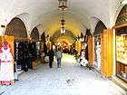 Al-Madina Souq (Arabic: سوق المدينة) is the covered souq-market located at the heart of the Syrian city of Aleppo within the walled ancient part of the city. With its long and narrow alleys, al-Madina Souq is the largest covered historic market in the world, with an approximate length of 13 kilometers.[1] It is a major trade centre for imported luxury goods, such as raw silk from Iran, spices and dyes from India and many other products. Al-Madina Souq is also home to local products such as wool, agricultural products and soap. Most of the souqs date back to the 14th century and are named after various professions and crafts, hence the wool souq, the copper souq, and so on. Aside from trading, the souq accommodated the traders and their goods in khans (caravanserais) scattered within the souq. Other types of small market-places were called caeserias (قيساريات). Caeserias are smaller than khans in size and functioned as workshops for craftsmen. Most of the khans took their names after their function and location in the souq, and are characterized by beautiful façades and entrances with fortified wooden doors.
