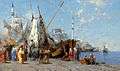In 1862 at Istanbul, he painted a canvas depicting a Victory by the Turks led by Sultan Abdul Mezid. He exhibited at Paris: The Druze attack a Maronite Village, Falcon hunt in plains of Ispahan, The Bazaar of Istambul, and The stage of the caravan, found in the Museum of Parma. In Venice, and began painting vedute of the city, among other subjects including works depicting the Ponte dei Santi Apostoli, the ferry Cassou and the Rio Marin, Canal Grande; Traghetto San Toma ; Venice from the Giudecca ; Palazzo Grimani; Rio San Severo, Rio a Santa Maria Formosa ; and Palazzi Rezzonico, Foscari e Balbi. He also painted Porta di un bazar; Panorama of the Sierra Nevada; Porta del vino, Alhambra Porta of the sala delle due sorelle; Interno dello moschea dell'Alhambra; Porta d'una moschea, and Palazzo del Generalife; Porta di un vecchio arsenale; Mercato del lunedì nella piazza of the Moschea a Costantinopoli; Cavalli al pascolo in Siria; Cortile di un vecchio joly; La sentinella; Le staffette (Group of irregular cavalry at the door of a mosque in Asia Minor); Courtyard of the Lions in Granada; Gruppo di case nel Rubatto Yesel Giani; Un'arcata of the facciata di San Marco; Porta del Palazzo Moriani; and La Salute. The self-portrait he sent to the Uffizi in Florence is from 1888.