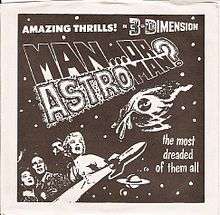 Amazing Thrills! in 3-Dimension is a Man or Astro-man? promo 7" that was given away with the first 1,000 copies of their debut album, Is It ... Man or Astroman?.[1] It was released on Estrus Records in 1993 on black vinyl only.[2] By some counts, 1,000 copies is a generous estimate, as the Estrus website places the actual number pressed as only 400 (200 given to the band and 200 distributed to the first 200 people to order the first LP directly from Estrus).[3] This is the first time Man or Astro-man's cover of the Mystery Science Theater 3000 theme song was released. It was later re-released on Destroy All Astromen!.