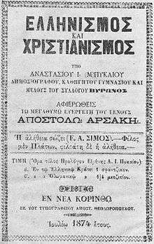 - 1 2 3 Zelepos, Ioannis (2002). Die Ethnisierung griechischer Identität, 1870-1912: Staat und private Akteure vor dem Hintergrund der "Megali Idea". Oldenbourg Wissenschaftsverlag. p. 94. ISBN 978-3-486-56666-6.