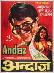 Andaz (Hindi: अंदाज़, English: Style) is a 1971 Hindi romantic movie starring Shammi Kapoor, Hema Malini, Rajesh Khanna and Simi Garewal. The film was directed by Ramesh Sippy.[1] The film was a considerable success and important in the career of Malini as an actress.[2] The film features "Zindagi Ek Safar Hai Suhana", one of the best known Bollywood yodels which also featured on the soundtrack of Mira Nair's Mississippi Masala.[3] The song fetched singer Kishore Kumar a nomination for the Filmfare Award for Best Male Playback Singer. When this film released, films of Shammi Kapoor were not doing well at the box office. The 10-minute cameo including made by Rajesh Khanna is credited for turning Andaz (1971) into a hit film.[4] This film is counted among the 17 consecutive hit films Rajesh Khanna between 1969 and 1971, by adding the two hero films Marayada and Andaz to the 15 consecutive solo hits he gave from 1969 to 1971.[5]