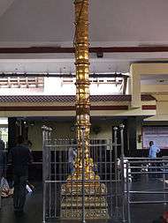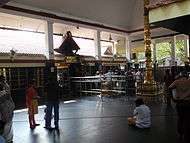 When Anna Nagar was developed as a model town in the late 1960s, the annual vilakku pooja during the mandala makaravilakku season was celebrated by Ayyappa devotees in the newly formed Shanti Colony. The residents' response to this annual celebration resulted in the formation of the Sri Ayyappa Seva Samajam (SASS) in 1976, with 14 members in its committee. In 1979, the Samajam started a charitable medical centre for the poor and needy.[1] The same year, a 7-ground land near the Visveswarayya Tower was allotted to the Samajam by the Tamil Nadu Housing Board for the construction of a temple, for which members contributed ₹ 38,000 towards initial payment.[1] Initially, a makeshift temple was built in a thatched shed along with a charitable medical centre in another shed.[2] Work on the construction of a permanent temple continued for the next five years in consultation with temple architect Kanipayyur Krishnan Namboodiri. The construction was guided by P. N. Subramaniam, the founder-president, P. Chandrasekhara Menon, the second president, and P. V. Nair, and financial support was provided by R. Ratnam, then chairman of Sundaram Industries, and P. Velayudham.[1] In May 1984, the typical Kerala-style temple was completed, conforming to the traditional shastraic stipulations. The kumbabishekam and consecration of the idol were performed on 13 May 1984 by temple Thantri Abli Krishna Vadhyan Namboodiri and K. M. Kesva Battatripad, former chief priest of the Sabarimala Temple.[2] The panchaloka Ayyappan idol was made by Chenganur T. Rajarathinam.[1] Idols of Ganesha, Subramanya, Goddess Durga, and Anjenaya were also consecrated. Later, a Navagraha (the nine planets) shrine was added in the temple. In 1989, a unique architectural structure known as the Natamandapam with an imposing gopuram was added. In 2005, gold covering of the 22-paras (segments) dwajasthambam and 27 thazhikakudams with about 6 kg of gold was completed. A special kumbabishekam of the gold-covered dwajasthambam was performed on 20 June 2005.[2]