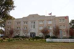 The Arkansas County Courthouse for the Southern District is located at Courthouse Square in the center of De Witt, Arkansas, the seat for the southern county of Arkansas County. It is a three-story brick building with Art Deco styling, designed by Little Rock architect H. Ray Burks and built in 1931. It is one of the finest examples of Art Deco architecture in the state. It is built in the shape of an H, with vault additions made in 1971 the only asymmetrical element. Its main entry (on the western facade) is a simple double-leaf entry with transom window, topped by a concrete panel with floral design. This is topped by a pair of large windows, with a concrete panel with signage and clock above and a raised parapet at the top.[2]