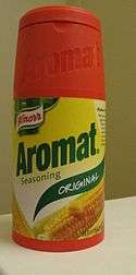 Aromat is the brand name of a mass-produced general-purpose seasoning produced in Switzerland and South Africa under the brand name Knorr, which is owned by the Unilever group. Packaging is generally a red plastic bottle with a yellow label bearing its name in green lettering, but it is also now sold in yellow bottles. It is marketed predominantly in Europe and in South Africa, although is also known to be marketed in Australia, Hong Kong and parts of the Middle East.