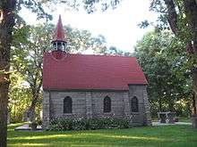 In 1952, in honor of the centennial of the diocese of Saint Cloud, the Chapel was rebuilt. The current chapel stands sixteen by twenty-six, the approximate size of the original chapel.[2] It is constructed of rough granite, much of which was donated by the Cold Spring Granite Company, a major local business.[5] The inside of the Chapel is simple and has no pews, only an altar. The chapel walls are made of polished agate and carnelian granite.[2] Four simple stained glass windows enhance the interior of the chapel. Above the altar stands the wooden statue that had been carried in procession through the Cold Spring community at the time of the Chapel's original consecration. The most telling feature and testimony to the history of the chapel is the stone carving above the door. It is inscribed "Assumpta est Maria" ("Mary has been taken up"), referring to the new name given to this reconstructed chapel. Mary is pictured between the words but at her feet, bowing in submission, are two kneeling grasshoppers.