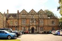 Access to the main house is via a semi-circular headed doorway with rusticated arch and a Ionic motif above a keystone.[2] Above the porch is inscribed "SLB 1912", which refers to the date of the final acquisition of the house and additions to it by Stanley and Lucy Baldwin. The porch is flanked by a transomed window and Ionic pilasters. On the interior, the entrance lobby has a Jacobean strapwork ceiling.[2]
