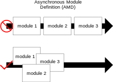 Asynchronous module definition (AMD) is a specification for the programming language JavaScript. It defines an application programming interface (API) that defines code modules and their dependencies, and loads them asynchronously if desired. Implementations of AMD provide the following benefits: