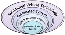 An automated driving system "is a driving system of automobiles that can be defined as systems where perception, decision making, and operation by a human driver while driving an automobile are performed by electronics and machinery instead of a human driver, and as introduction of automation into road traffic."[1] This included handling of the vehicle, destination, as well as awareness of surroundings.