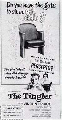 In the late 1950s, William Castle was even better known as a B filmmaker than Corman. A long-time director and producer of mostly low-end movies for Columbia, including several entries in the studio's Whistler detective series, he left in 1957 to establish the independent Susina Productions with writer Robb White. Castle was the great innovator of the B-movie publicity gimmick. Audiences of Macabre (1958), an $86,000 production distributed by Allied Artists, were invited to take out insurance policies to cover potential death from fright. With this film and his next collaboration with White, House on Haunted Hill (1958), another Allied release, Castle "combine[d] the saturation advertising campaign perfected by Columbia and Universal in their Sam Katzman and William Alland packages with centralized and standardized publicity stunts and gimmicks that had previously been the purview of the local exhibitor."[22] Castle and White's 1959 creature feature The Tingler, distributed by Columbia, featured his most famous gimmick, Percepto: at the film's climax, buzzers attached to select theater seats would unexpectedly rattle a few audience members, prompting either appropriate screams or even more appropriate laughter.[23]
