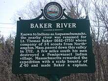 The Baker River's name recalls Lt. Thomas Baker (1682–1753), whose company of 34 scouts from Northampton, Massachusetts passed down the river's valley in 1712 and destroyed a Pemigewasset Indian village. It was along this river on April 28, 1752 that John Stark and Amos Eastman were captured by Abenaki warriors and taken to Saint-François-du-Lac, Quebec, near Montreal. John Stark's brother William Stark escaped, and David Stinson was killed during the ambush.