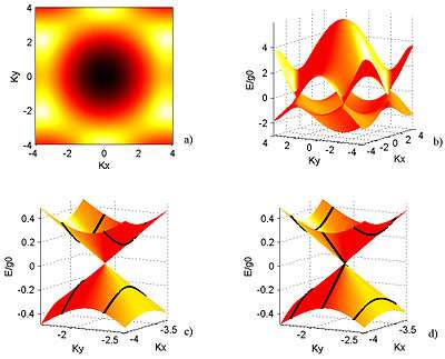Figure 1: a) Energy contour plot of the electronic band structure in CNTs.; b) Linear dependence of the electron energy on the wave vector in CNTs; c) Dispersion relation near the Fermi energy for a semiconducting CNT; d) Dispersion relation near the Fermi energy for a metallic CNT