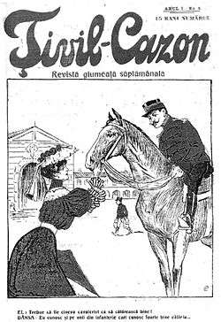 In 1906, he founded the satirical weekly Țivil-Cazon ("Civilian-Conscript"),[18] for which he used the pseudonym "Bélé".[3] The magazine hosted the work of Ioachim Botez, Ioan Dragomirescu-Dragion, Leon Wechsler-Vero, and Victor Eftimiu,[19] who was also a pseudonymous co-editor. Eftimiu and Lăzăreanu's work for it included rhyming quatrains that parodied or mocked the more serious literary reviews.[20] Eftimiu noted, years later, that Bélé was "very talented".[21] Țivil-Cazon became the first Romanian journal of its kind to feature colored prints, and included artwork by Iosif Iser, Nicolae Petrescu Găină, and Nicolae Mantu. Heavily inspired by Ion Luca Caragiale and his Moftul Român, it mainly targeted Romanian Army personnel, depicted as slow-witted and (especially if cavalry officers) as sex objects.[22]
